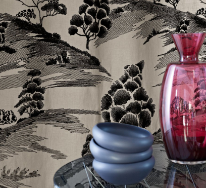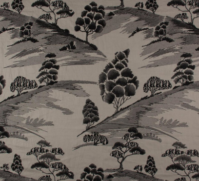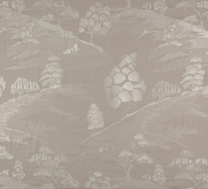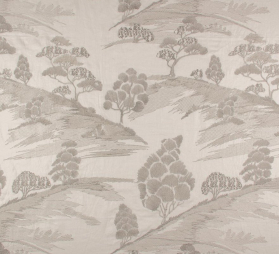 Как художественный рисунок, слегка мерцающая вышивка украшает матовый льняной фон этой ткани для штор. Множество сложной вышивки различной плотности используется для создания сказочной пейзажной сцены. Низкие холмы в сочетании с экзотическими деревьями создают впечатление перспективы.