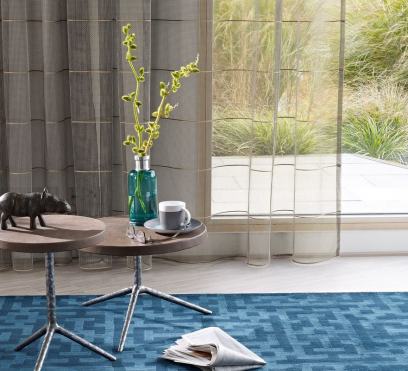 Ткань для штор Drive представляет собой легкое плетение с несколько металлическим видом, украшенное аппликацией из искусственной кожи.