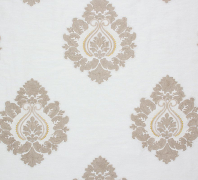 Brera - элегантная полупрозрачная ткань для штор с шикарно вышитым рисунком медальона. Мягко драпированный сдержанный фон обеспечивает захватывающий контраст с легко мерцающей, роскошной и сложной вышивкой. Ручная отделка вышивки по-настоящему отличает эту ткань.