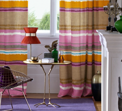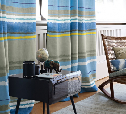 В ткани для штор Horizont 19539 видна цветовая палитра коллекции «Carnet de Voyage» с выразительными горизонтальными полосами, прямо как в альбоме для рисования. Например, с синим тоном вы можете услышать шум моря и представить песок и небо. Всего в ткани Horizont представлено пять выразительных настроений. Льняной материал прекрасно передает цвета и поддерживает технику акварели с ее зернистости.