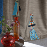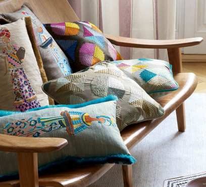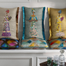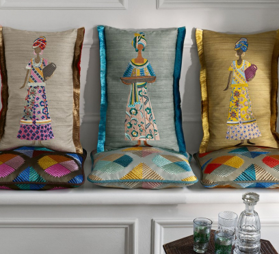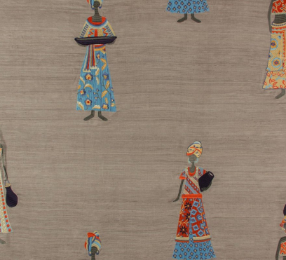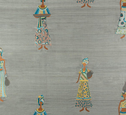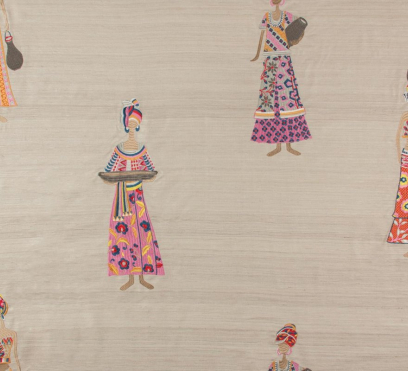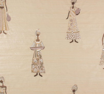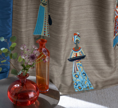 Ткань для штор с замысловатой вышивкой на тусарском шелке ручной работы. Мотив состоит из гордых женщин в роскошно украшенных одеждах. Одноцветный фон создает интригующий контраст с яркой, детальной вышивкой.