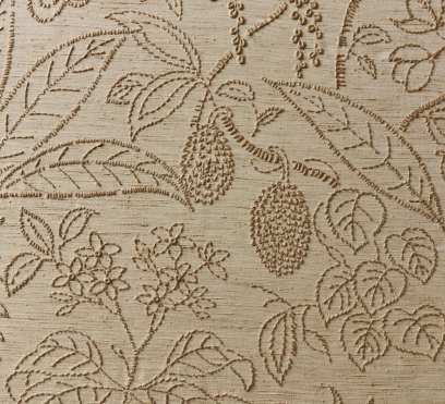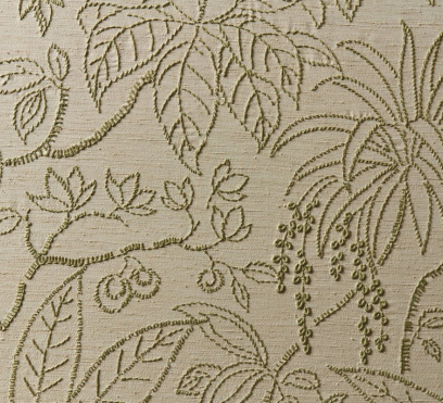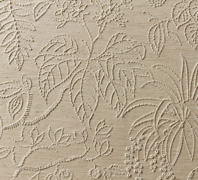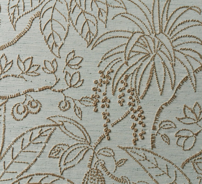 Ткань для штор Oasis украшена вышивкой, которая изображает лиственный рай. Цвета на ней красиво контрастируют с естественной структурой фона.