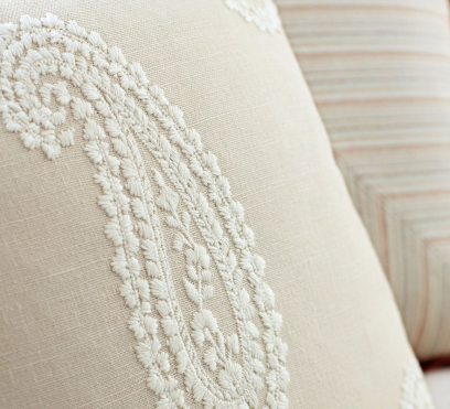 В этой ткани для штор с вышивкой присутствует мотив пейсли в виде слезы, вышитый плотной хлопчатобумажной пряжей в технике, имитирующей ручную работу Сдержанный вид вышивки на простоватом льняном полотне придает ту самую естественную элегантность, которую так любят клиенты Hodsoll McKenzie.