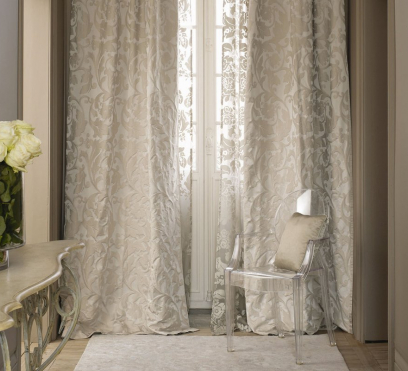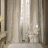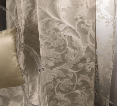 Nostalgia - нежная струящаяся прозрачная ткань для штор (тюль). Идеально подходит для использования в высоких помещениях. Ее растительные цветочные мотивы создаются с помощью уникальной технологии, известной как "техника выгорания". Ее суть которой сводится к созданию рисунка за счет растворения части волокон с помощью особых химических веществ. Эта прозрачная ткань сфотографирована на ярком фоне.