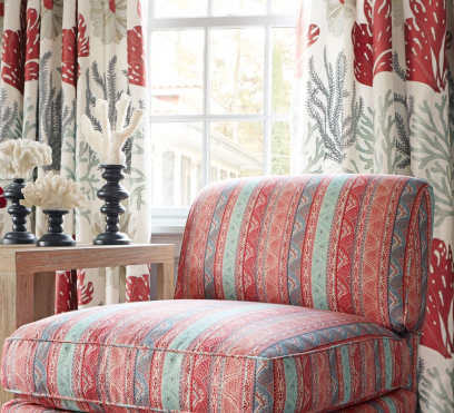 Вдохновение для печатного дизайна этой ткани для штор пришло из старого тканого документа из архива фабрики. Документ датируется 19 веком. Дизайн предположительно из эльзасского региона Франции из-за характеристик плетения, отображаемых в оригинальном документе. Поскольку каждая полоса в этой ткани разноцветная, ее универсальность позволяет гибко проектировать комнату и работать по всей цветовой палитре.