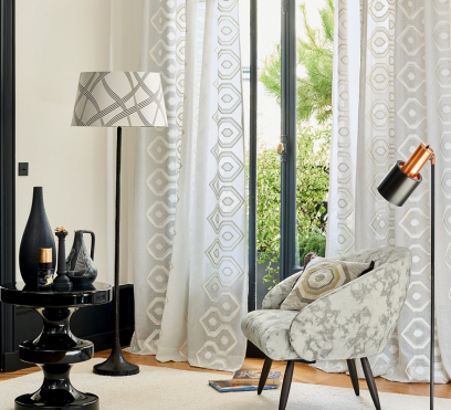 Ткань для штор Scirocco - текстиль для влюбленных. Высокий уровень мастерства можно увидеть в его графическом, выразительном мотиве, который просто захватывает дух. Высокое качество вышивки также подчеркивается элегантным переливчатым эффектом фона.