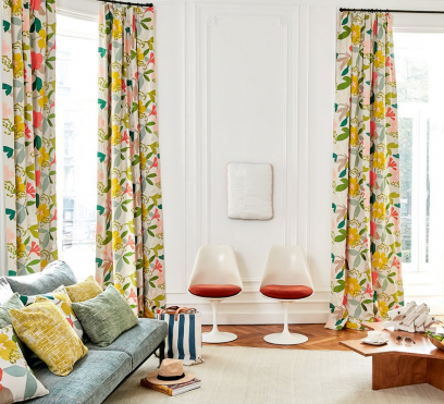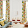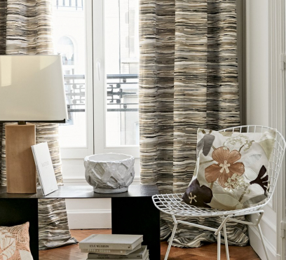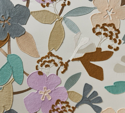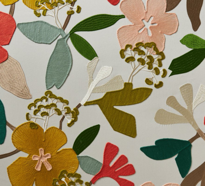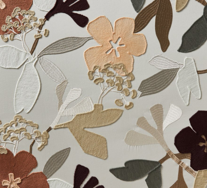 Ткань для штор Tiaré названа в честь национального цветка Таити, традиционно предлагаемый в гирляндах, чтобы приветствовать посетителей. Интерьеры с вышивкой на хлопковом атласе выглядят современно и призваны стать миром вдали от традиционных, строго цветочных клише. Простые, нежные формы напоминают витражное искусство Анри Матисса. Лепестки цветов вышиты цепным стежком с матовой шерстяной нитью и искусно связаны с листьями, вышитыми ярким атласным стежком. Направление сшивания деликатно повторяет формы дизайна. Выпуклые лепестки делают дизайн Tiaré щедрым букетом. Десять цветов нитей, тщательно отобранных во время процесса окрашивания, вдохновлены жизненной гармонией цветов Таити.